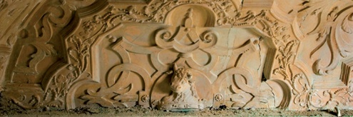 The design of the strapwork here is very simple in comparison to the Long Gallery or Dining Room. The strapwork is flat and square and varies in width by 10-15mm, suggesting that it was formed freehand. Small rosettes were cast and pressed into the strapwork while it was still wet. No sign of an adhesive layer could be seen, suggesting wet mortar was pushed onto wet mortar. During repairs a mould was made of one of the rosettes using plaster of Paris. This was then filled with the repair mortar and immediately pressed into some soft strapwork. The result was a rosette which became part of the strapwork, rather than one that had been stuck to it.