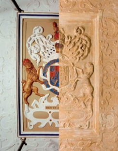 The King’s Room ceiling and (right) a detail of its heraldic central panel before and after paint removal |