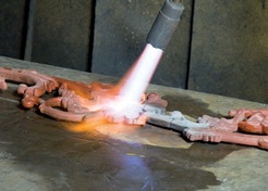 In some cases, a furnace can be used for preheating the casting, but in many instances it is more effective to make an improvised enclosure using refractory materials. This allows the casting to be preheated to a temperature of 200-300°C using oxyacetylene equipment connected to a pepper-pot nozzle which diffuses the heat over the widest possible area of the casting. This temperature is maintained throughout the welding cycle and, when the weld is completed, a very slow, even cooling rate must be achieved.
