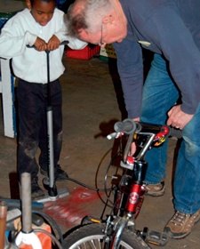 A participant and his mentor at Neighborhood Bike Works, an innovative programme hosted by St Mary’s Episcopal Church in West Philadelphia. Children aged 8-18 can join the Earn-a-Bike programme to learn about bike safety and repair. Those who complete the programme earn their own bike, helmet and lock. |