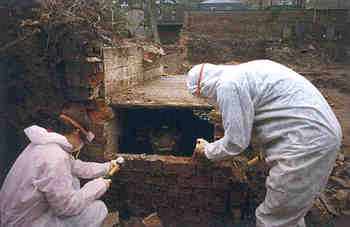 The design and inscriptions on memorials and gravestones usually provide a fascinating source of information but, at Holy Trinity, previous clearance and building work since the 1960s had removed all but six gravestones. Many more remained on site being stacked in buried piles or lined up against walls , but as no graveyard plan had survived the gravestones could no longer be related to their graves.They showed that an architect, a solicitor, even a surgeon were all buried there, as was at least one murder victim of 1844 whose end was documented in the contemporary press. In the last instance identification was not possible as the person's grave could not be associated with a particular body.