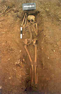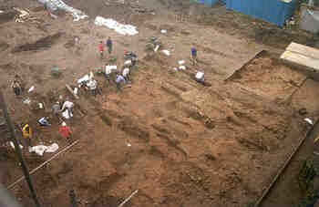 The creation of the cemetery smothered the former cathedral ruins under an 8-foot blanket of imported soil, and before Northamptonshire Archaeology could excavate the cathedral, the problems this posed had to be addressed. This soil overburden amounted to 3,500 tons which were removed by machine under archaeological supervision to reveal a carpet of burials. Details of each articulated skeleton and associated coffin fittings were entered onto a GIS (geographically coordinated) database originally designed by Northamptonshire Archaeology staff for use by the United Nations Commission on war crimes in the former Yugoslavia (Bosnia). Following considerable adjustment for local conditions, this enabled the excavation team to work quickly and methodically to clear the graveyard while still retrieving the archaeological information which graveyard clearances so often lose.
