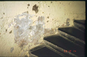 Interstitial condensation occurs when relatively warm moisture-laden air diffuses into a vapour-permeable material or structure such as fibrous insulation or a porous brick wall. If it is relatively warm on one side and below the dew point temperature on the other; this can result in the moisture-laden air reaching ‘dew point’ within the material and depositing liquid water at this point. This becomes a particular problem if the diffusion of the moisture vapour through the material is restricted towards the cold side of the structure and if the insulation or thermal conductivity of the structure is such that the temperature profile is skewed towards the relatively warm side. The risk of condensation in these circumstances can be calculated using graphs and formulae, or using specialist computer programmes, and it can become a particular problem in heavily insulated or air-conditioned buildings. This is especially important when dealing with the conservation of buildings in extreme environments such as the conservation of buildings in the tropics, which tend to be airconditioned on refurbishment. In this situation, interstitial condensation can be a significant problem; and it is necessary to turn the usual calculations back to front, as conditions will be warm and wet on the outside and cold and dry on the inside of the structure. Similarly, extreme conditions can occur in very cold environments, and when refrigeration units are introduced, without adequate ‘vapour checks’ or insulation.