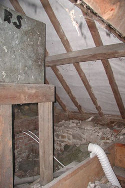 An exhaust duct from an extractor fan in a shower unit installed in an 18th century country house, is shown discharging into the roof void and providing the conditions for condensation, mould growth and insect decay in roof timbers. It also shows an uninsulated cold water tank which resulted in cold bridge condensation of moisture laden air. |