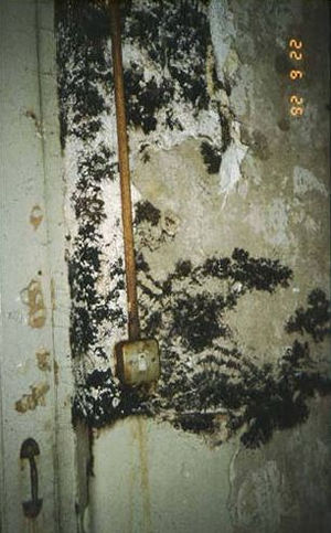 This mould growth on contaminated wallpaper represents a potential environmental health hazard to those occupying the building. |