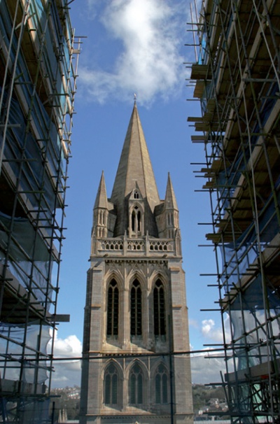 Truro Cathedral, with the west towers under scaffolding and the central tower beyond. As a place of