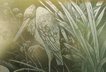 Sophisticated images that resembled wood block engravings could be produced using white acid in combination with embossing acid (such as the heron, illustrated above).