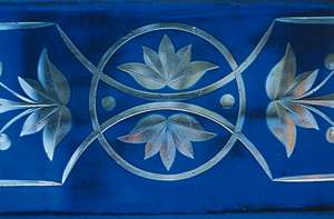 The trades of brilliant cutting and acid etching had developed independently but when they frequented the public house they joined forces and, together with other decorative glass techniques such as bevelling, silvering and gilding, produced some of the most elaborate effects in the history of decorative glass (illustrated left). Cartouches, swags and arabesques in unrestrained and intemperate excess decorated the glass surface. This battery of techniques, principally based around frosted acid etching and brilliant cutting, were sometimes referred to as French embossing because of the similarity in design with the French decorative style, the rococo. Many of the designs are clearly adapted from this source.