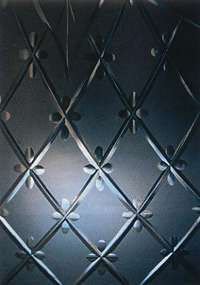 Brilliant cutting was (and still is) a highly skilled and labour-intensive process. Each cut required a different wheel and sometimes these had to be custom-made to suit the particular job in hand. However, the process did not always stop there. With the exception of flashed glass (see the first illustration, top of page), most brilliant cut work had a frosted background. If this was to be of a single tone the sheet was usually mechanically abraded using emery flour in a process akin to 'emboss and ground' (see above). Frequently though, brilliant cut sheets were acid embossed either with a clear etch or white acid and triple emboss. Areas of the design were sometimes gilded and often the whole sheet was silvered to produce a decorative mirror.