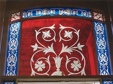 Plate glass, because of its thickness and weight, provided the ideal surface for these decorative techniques. They in turn created privacy and enhanced illumination. Furthermore, these techniques offered the opportunity for introducing glittering and unrestrained decoration. With the exception of bottles and glasses there could have been no better addition to the drunken rococo decoration of the Victorian public house.