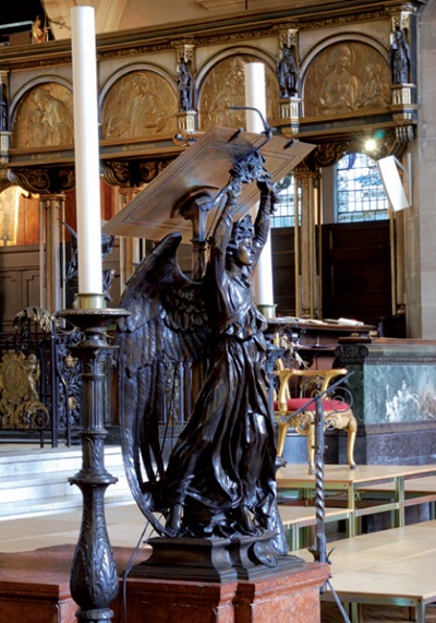 HH Armstead’s bronze lectern of 1890 with choir stalls beyond by FW Pomeroy |