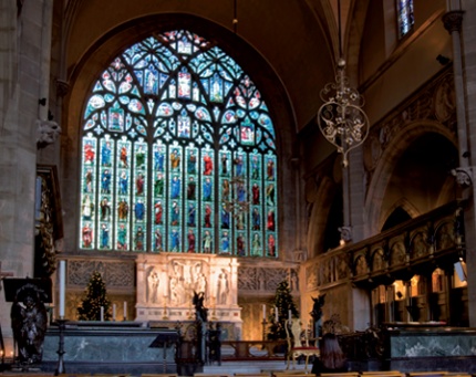Even among this extraordinary confluence of art and architecture, Holy Trinity’s stained glass is often considered the finest of its treasures. The most notable example is the Great East Window, designed by the pre-Raphaelite painter Edward Burne-Jones. It is a classic example of a 12 light window and depicts 48 figures including prophets, apostles and saints beneath scenes from the Nativity, the Garden of Eden, the Crucifixion and the Annunciation. The window is the largest ever manufactured by Morris & Co.