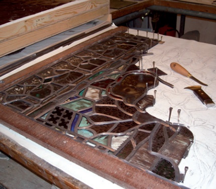 The windows were removed by carefully chipping away the perimeter mortar and the panels were then transported to the workshop. In the workshop a number of steps were carried out in the conservation of the stained glass. These were as follows: