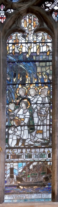 Window III is a four light window depicting The Holy Spirit and the Pentecost, and dates from 1907. It was designed by Whall and made with the collaboration of his pupils and assistants at his newly established studio-workshop at 1 Ravenscourt Park, Hammersmith. The window was donated to the church by Frederica Cook in memory of her husband, Wyndham Francis Cook, who died in 1905.