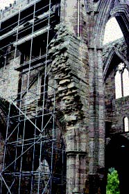 | Tintern Abbey: Frank Baines, Architect in charge of Ancient Monuments and Historic Buildings, specified in 1911 that no cement was to be used on the face of the masonry, and that Blue Lias, Aberthaw or Arden Lime (moderately to eminently hydraulic limes) were to be used exclusively in the consolidation of wall tops and facework. |