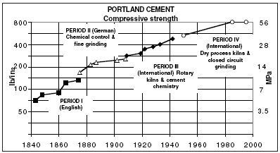 Limes are burnt at temperatures below 1,000°c where the main reaction products are belite and free lime together with small amounts of low reactivity aluminates. Portland cements are burnt at temperatures up to 1,500°c where almost all lime is combined, forming alite, which is the main product, and reactive aluminates. The development of hydraulicity as measured by compressive strength resulting from changes in technology over the past two centuries is illustrated in Figure 2 (right).