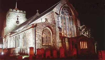 ![]() St Mary's, Eastbourne. First floodlit with gas lamps for the 1937 coronation, the current scheme uses metal halide projectors with some in specially designed stone housings. The interior lighting is used to advantage to add interest to the east elevation, which cannot be wholly floodlit |