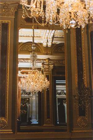 In the larger houses of the time, fixed light fittings included sconces, hall lights and chandeliers. Sconces (wall fittings) often had a mirror behind them to reflect more light, and were often on either side of the chimney breast. Hall lights, which might be pendant or wall fittings, consisted of a candle in a glass case to protect it from the draught when the door was opened. Chandeliers (suspended fittings with radiating arms) were hung in the most important rooms only and were often designed to light these rooms in a most spectacular fashion. However, keeping the many arms of the most impressive chandeliers alight was an extravagance reserved for special events, such as weddings. After George III visited the Dowager Duchess of Portland at Balustrode in 1779, her friend Mrs Delaney wrote: 'Her Grace had the house lighted up in a most magnificent manner; the chandelier in the great hall was not lighted before for twenty years.' (From Lighting in the Country House).
