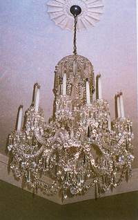 THREE LIGHT FITTINGS FROM A LATE 18TH CENTURY HOUSE IN LONDON. Top: a crystal chandelier. Middle: a colza oil lamp with a central resevoir. Bottom: A gilt wood candelabra converted to electric. |