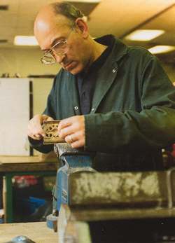 A craftsman at Denmans Montrose Ltd cleaning the 'flashing' or mould lines from a cast replacement for the 'gallery' of a light fitting. Originally stamped from very thin metal, the cost of making a new stamp for individual repairs is prohibitive, and individual replacements have to be cast from moulds made from the original component. |