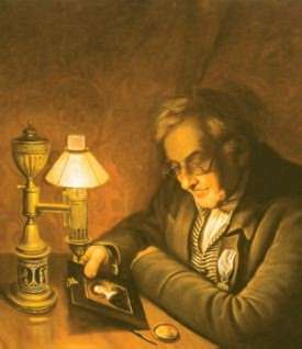 An Argand oil lamp illustrated in the 1822 portrait of James Peale by his brother Charles Wilson Peale. In this design the reservoir for the thick colza oil supplies one light only and is urn-shaped. The shade is probably silk (Detroit Institute of Arts, USA/Bridgeman Art Library: Founders Society purchase and Dexter M Ferry Jr fund) |