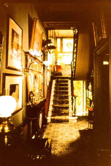 Late 19th century paraffin lamp and gas wall brackets in the entrance hall of the Linley Sambourne House, London. (Victorian Society, Linley Sambourne House, London/Bridgeman Art Library) |