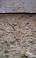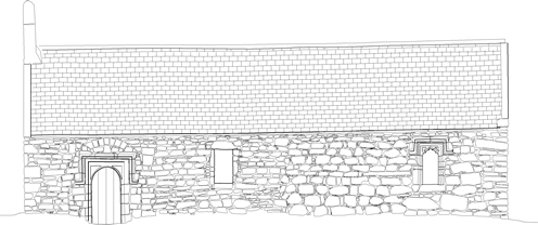 There are two types of stone used in the building: sandstone grit thought to be from the Bodorgan Paradwys area on the north side of the Malltraeth estuary, about four miles from the site; and schist, a metamorphic crystalline rock which exhibits a layered structure and is found plentifully on the shoreline at Llangwyfan. The archaeologists believe that the evidence points to the earliest stone church on the site being built in the 12th century using the sandstone. There is a clearly defined projecting string course of very weathered moulded sandstone half way up the wall on either side of the door, to just beyond the first window. There is a similar feature in remaining 12th century masonry at Aberffraw church. It has long been known that the present door arch, although very old, had been fitted into a larger and older arch, and when the old pointing was stripped away it was possible to see the earlier doorway with its distinctive semi-circular arched head – which is possibly 12th century. It was also possible to see clearly that the lower courses of the west gable, and the westerly half of the south wall, were constructed with small neatly cut sandstones; and it was easier to see the string course. (This is shown in the archaeologist’s drawings below).