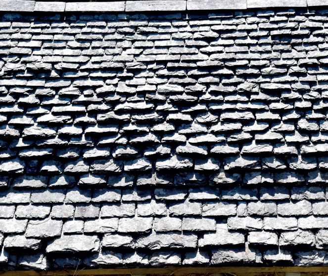 Reslating the nave and loggia – ferrous inclusions on the original slates prevented many of them from being reused in the foreground |
