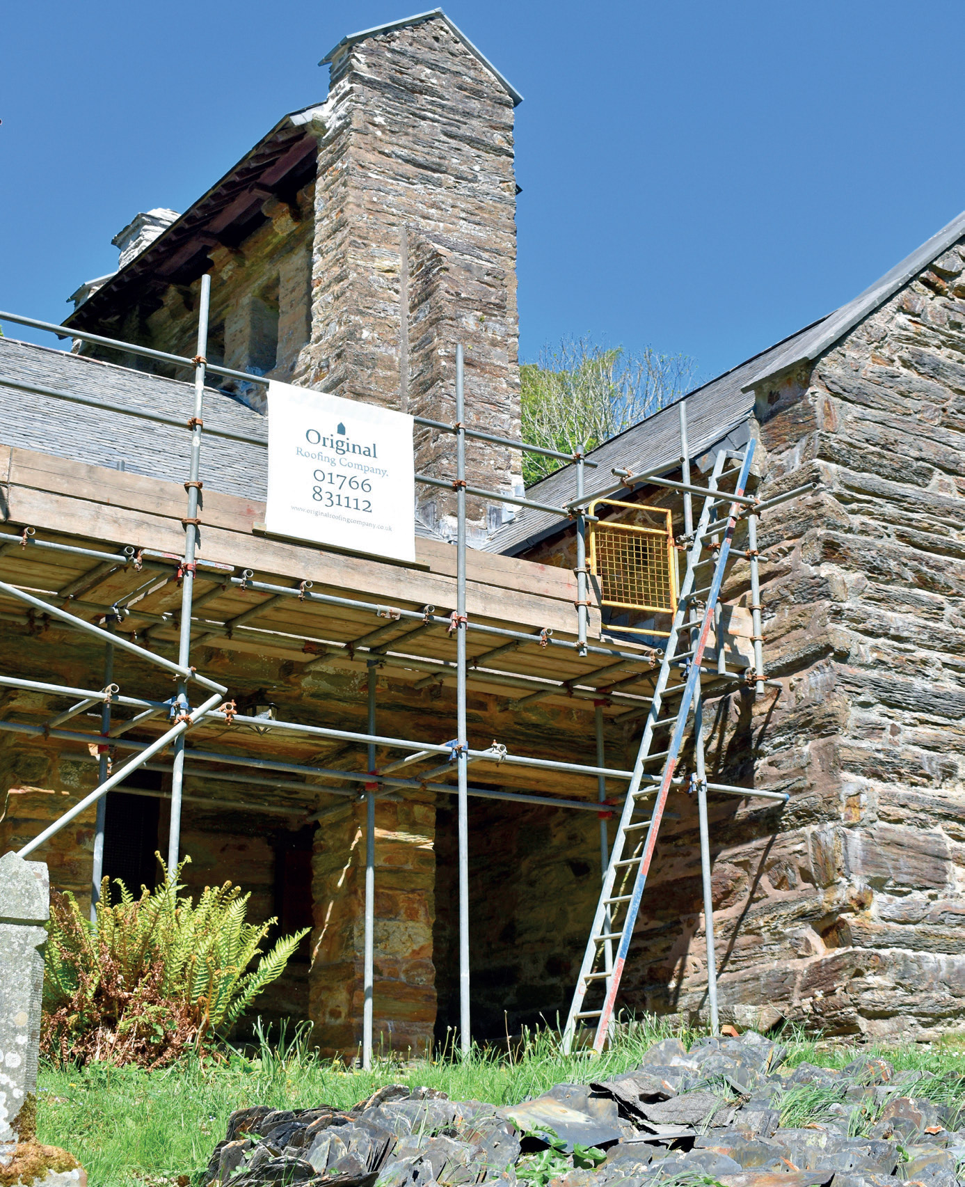 The joints of the rubble-slate walls had at one time been buttered over with a thick cementitious mortar. This was causing localised decay of the stonework and significant internal damp. While the scaffold was in place, it was prudent to rake out the cement and repoint in lime mortar.