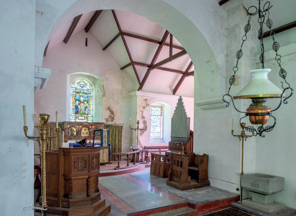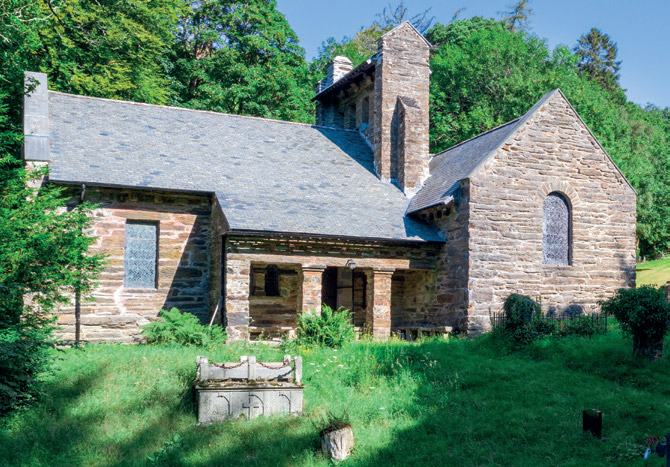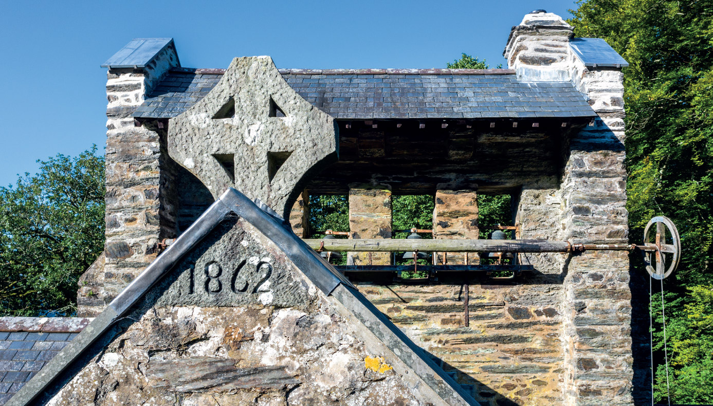 The rusty, rubble-slate construction includes a lean-to loggia with stone benches and pairs of round-headed, Romanesque windows. A unique bellcotecum- chimney holds four bells that could be rung by a large wheel, found in a shelter on the north side of the church. For many years these were rung by Bill Tilman mountaineer and explorer, who scaled Mount Everest twice in the 1930s.