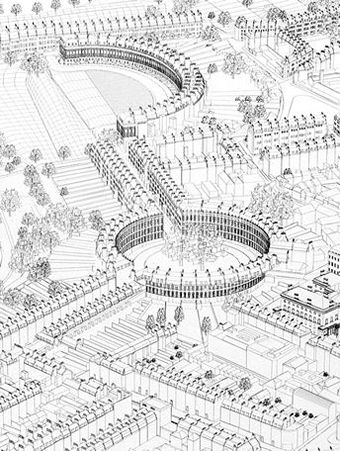 | Figure 3 A computer generated model of part of the city of Bath, illustrating how spaces and spatial relationships as well as buildings define the character of conservation areas. The Royal Crescent is at the top with the King’s Circus below. (Image: CASA, Bath University) |