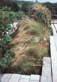 Above: Roses and other woody vegetation have led to fracturing and progressive collapse of the wall head. Below: To ensure that the soft top retains its authentic character, seeds are collected before stripping the 'natural' soft top and consolidating the masonry. Bottom: Hard cement capping after clearance, showing extensive root penetration into the wall head. | Above: Grass and non-woody vegetation removed from wall heads can be retained on plastic sheeting with hydroponic gel, and watered regularly. Below: Woody vegetation has been removed and the wall head consolidated before the natural grass top is replaced. Wild flowers will follow in due course. Regular attention to maintenance will ensure that shrubs and trees are kept to the minimum. | |