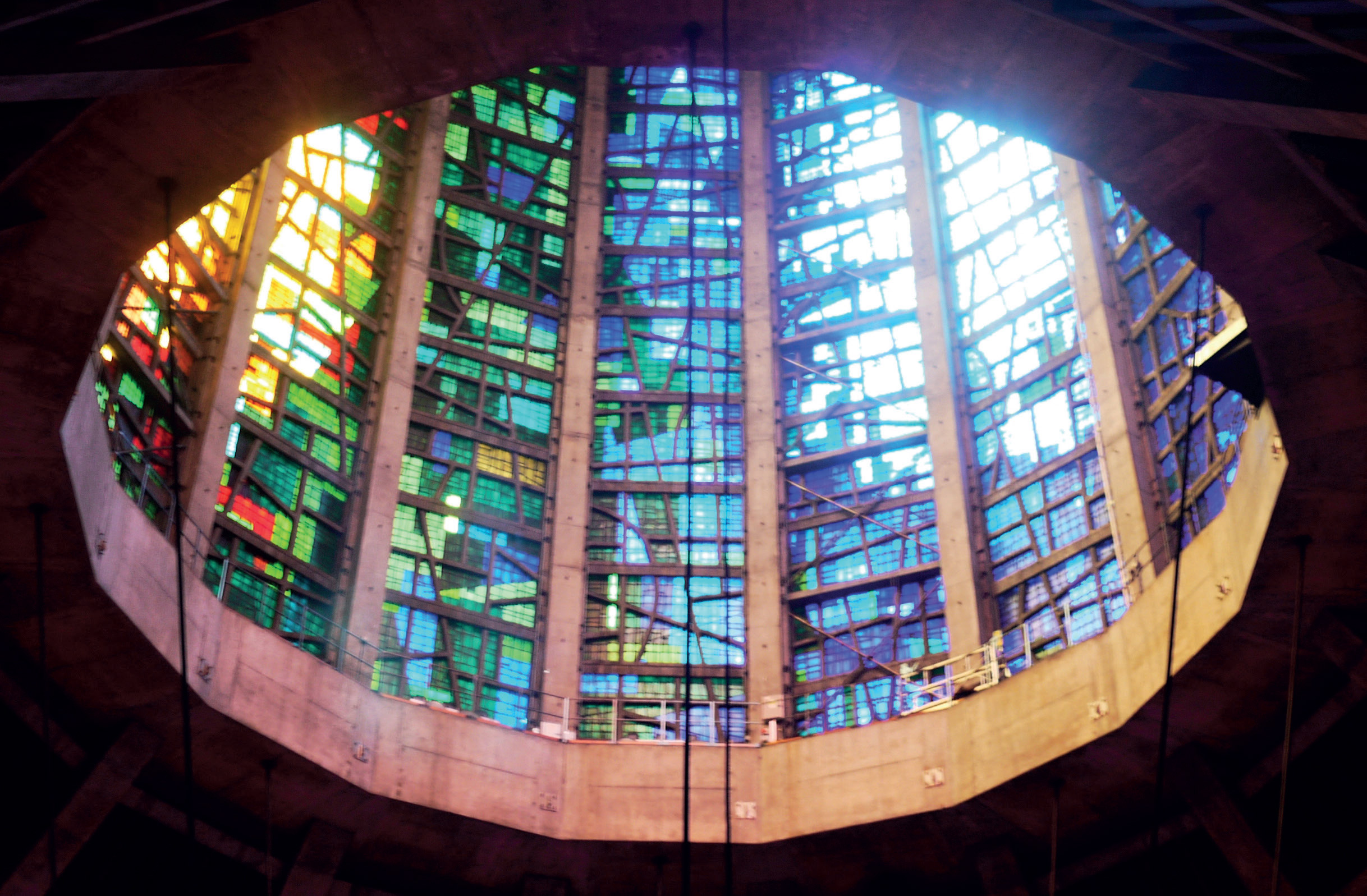 Liturgically, the design at Liverpool was also innovative and experimental, an outstanding monument to the Second Vatican Council. The interior of the cathedral is dominated by the unbroken space of the large circular nave around which the chapels are arranged, and which is dominated by its crowning glory – the lantern. The lantern contains one of the largest stained glass windows in the world and is constructed in ‘dalle de verre’ glass (see glossary) by John Piper and Patrick Reyntiens. At Liverpool, the lantern is the crowning glory, with Gibberd carrying through the belief that cathedrals, metaphorically and symbolically are the crown of the cities they inhabit.
