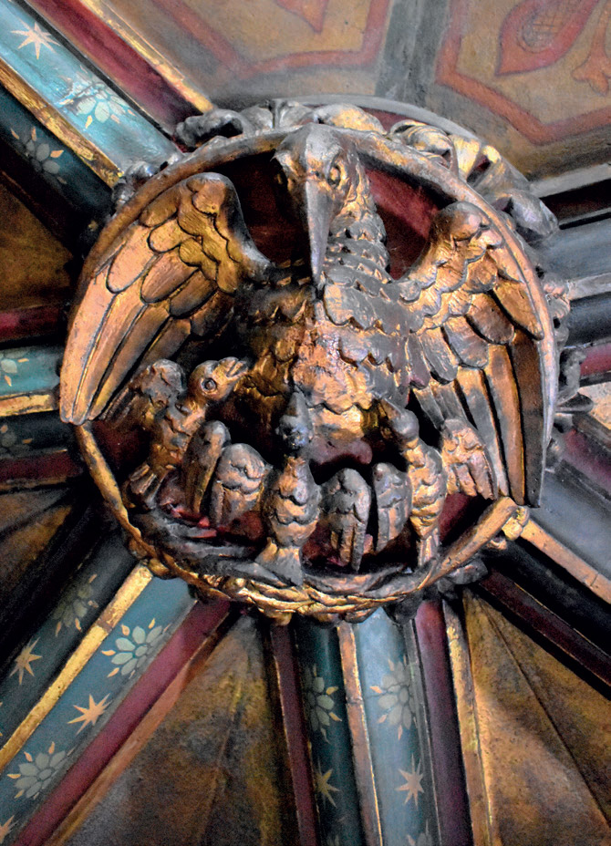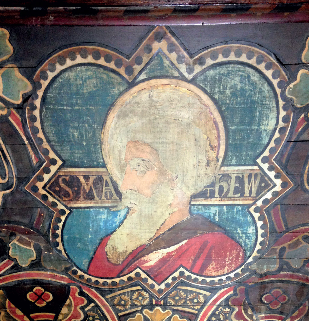 The chancel ceiling is strikingly different from the nave in form and style, with painted plaster spandrels separated by stone ribs: groups of saints are depicted at the east end, flanking the figure of Christ above the altar, while angels decorate the west end of the chancel. Here the style of painting is more delicate and narrative compared to the bold, almost cartoon-like design in the nave.