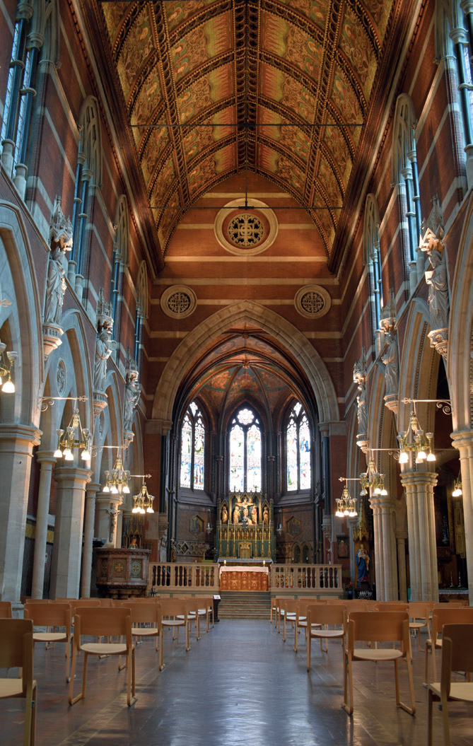 Inside, Street accentuates the highly decorative chancel and the upper levels of the nave by contrasting these elements with the austere red brick and white stone of the exterior and lower nave walls. Within the nave, the visitor’s eye is directed up to the statuary of Thomas Earp and the vast painted ceiling by Daniel Bell. In the chancel, the painted ceiling is attributable to Clayton and Bell, while the stained glass windows are by Henry Holiday.
