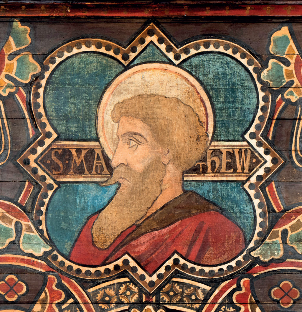 The choices made by those artists responsible for the incredibly rich decoration of St Mary Magdalene perfectly meet the challenges posed by its architectural setting in terms of distance, scale, materials and function within the religious setting of the church. Each decorative element attracts the viewer in turn and directs their gaze upwards towards the chancel. Conservation, however, revealed glimpses of the very human aspect of its decoration; artists’ signatures and notes, aids such as compass marks, templates and grids, mistakes and corrections, that give intriguing insights into the teams who originally undertook the work.