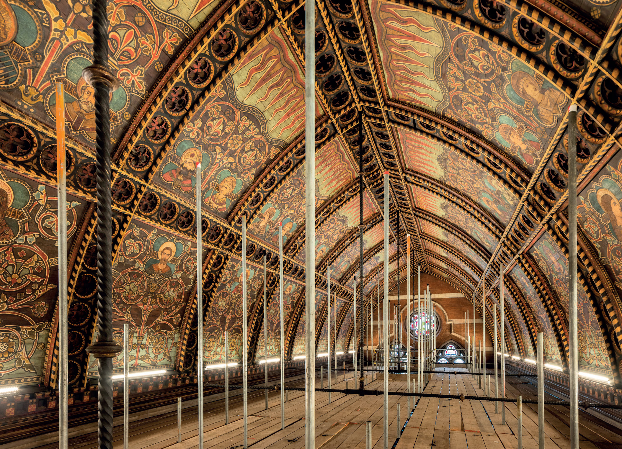 ENTERING THE church of St Mary Magdalene at Paddington, the visitor is struck by the great abundance of decoration. The chancel is particularly elaborate with every possible surface decorated, from the painted plaster ceiling to the painted brick walls, paint and gilding on every beam and column, stained glass windows and ornate alabaster wall tiles. The visitor is dazzled with a richness of colour, texture and fabric; precisely what the architect, George Edmund Street intended when he commissioned the leading artisans of the time to provide an inspirational place of worship to serve poor neighbourhoods around Paddington. This is also what made conservation at St Mary Magdalene such an exciting and diverse project.