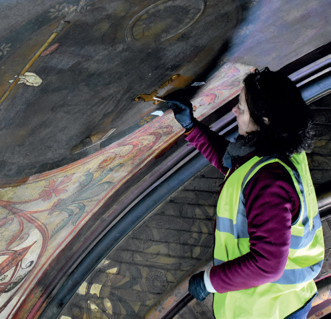 Conservators removing the darkened layers of varnish from the nave ceiling panels: the paper holds the cleaning gel in targeted areas. (Photo: Cliveden Conservation). | ||