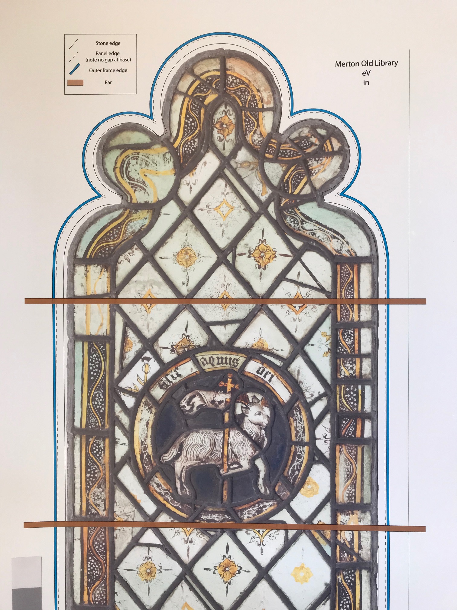 A CMM drawing worked up in Adobe Illustrator shows the proposed panel position and the frame position according to the stone profile of a window in Merton College Old Library, Oxford. |