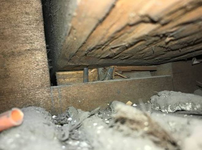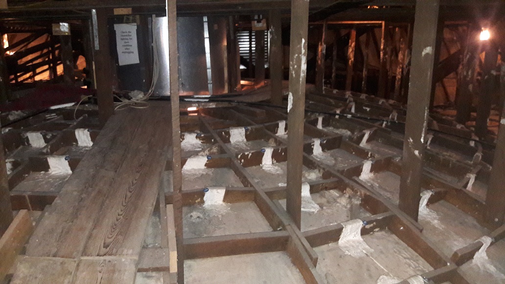 Once access to the ceiling void is obtained, cleaning is frequently found to be necessary due to the accumulation of dust and debris on the ceiling surfaces over the decades, obscuring the structural connections and projecting plaster nibs securing the ceiling to the laths.