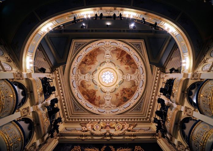 The highly decorative fibrous plaster ceiling of Wyndham’s Theatre in London, which is regularly inspected and defect-free (Photo: Conisbee, 2008)
