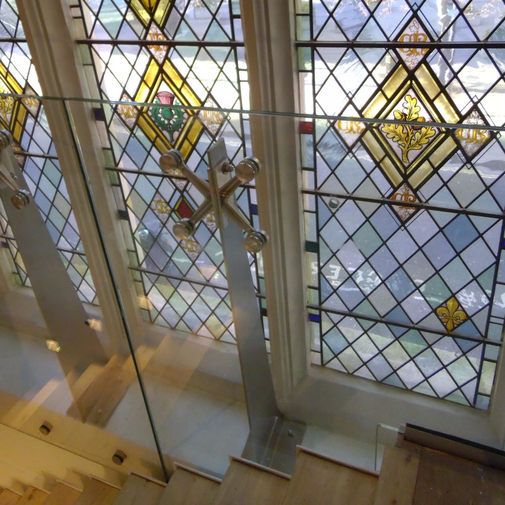 A series of individual glass panels was installed in front of the stone mullions using purpose-made stainless steel supports and spider fixings (right) to stand the glass off the stone and avoid any damage to the carved surface. The result is a stylish span of glass at the side of the stairs that highlights and protects the leaded windows without obscuring their intrinsic beauty or blocking natural light.