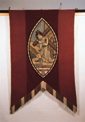 Each banner comprises of two separate parts; the main embroidered central panel and the banner backing to which it is fixed. They are also fully lined with a glazed plain weave linen. The technique used for the construction of the banners involved appliqué (italicised terms are defined in the glossary at the foot of this page), where sections of the design were outlined with black thread or velvet ribbon, making them reminiscent of stained glass. The religious images which form the central decoration of each banner were constructed from coloured silks, velvet, cloth of gold, embroidery silks, metal and chenille threads and they were also decorated with coloured cut glass jewels, parchment lettering, velvet ribbons and woven silk braid. The materials are all worked through to the linen foundation fabric which is oval in shape. The technique is simple and could conceivably have been worked by family members who were competent needlewomen rather than professional embroiderers.