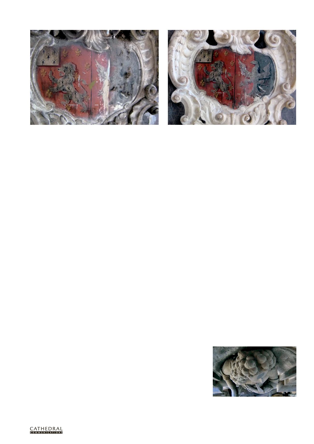 A finely decorated marble cartouche on a monument from the 1780s, before and after cleaning to remove dust, decorators paint and surface soiling. The monument had
