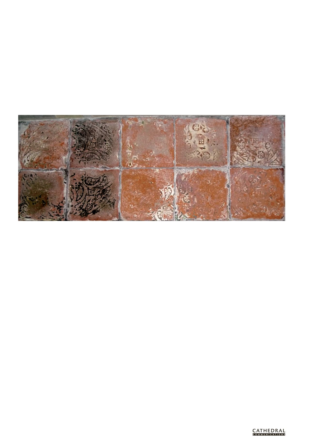 Medieval encaustic tiles in a church in Malvern, their pattern worn away over the centuries: laid on a solid floor in lime mortar, clay tiles provide a traditional solution