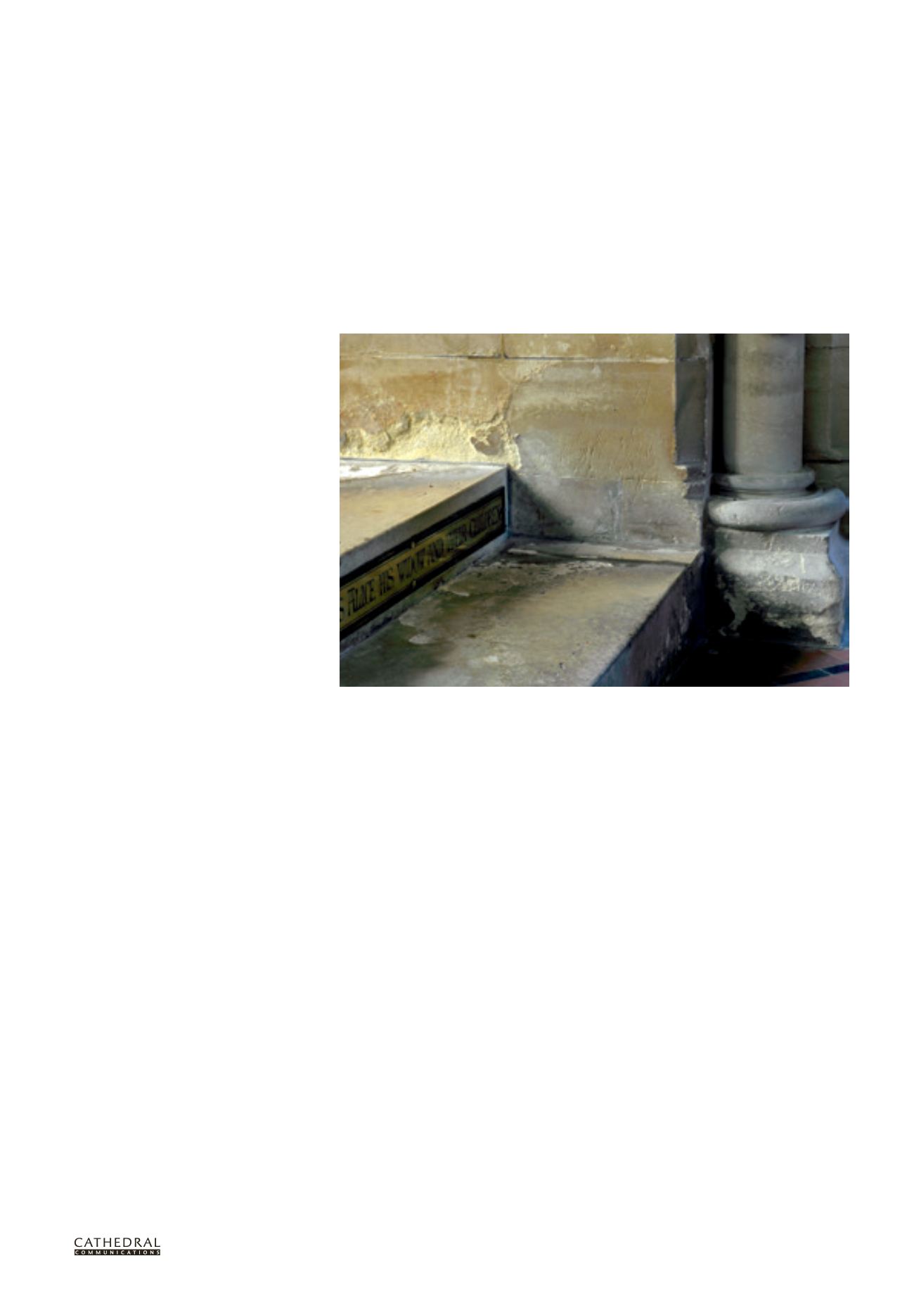 Typical damp at the base of a church wall, resulting in crystallisation damage to the ashlar masonry