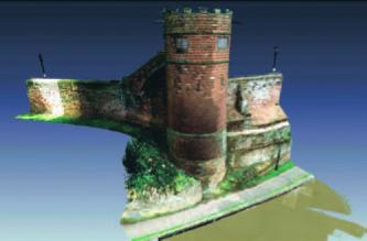 Figure 1 Colour-mapped image of a point cloud of King Charles Tower on Chester City walls. (Image: Russell Geomatics/