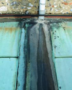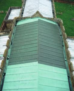 Left: Lead-staining caused by run-off froma higher lead-covered roof Right:The Church of St Mary the Virgin, Dalham, Suffolk: the roof was partially re-covered following storm damage.